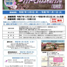 フラワー・ビジネススキルアップ科(短時間)の訓練生募集しています。 訓練期間 令和7年12月3日~令和8年4月2日 (募集締め切り 11/11まで) …